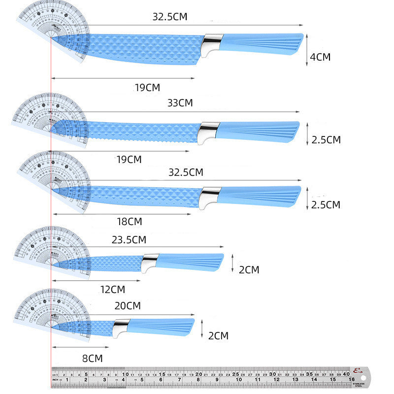 This six-piece set contains stainless steel + PP knives for cutting meat. vegetables. fruits. and vegetables. It includes a meat cutter. chef's knife. multi-purpose knife. fruit knife. bread knife. and holder.